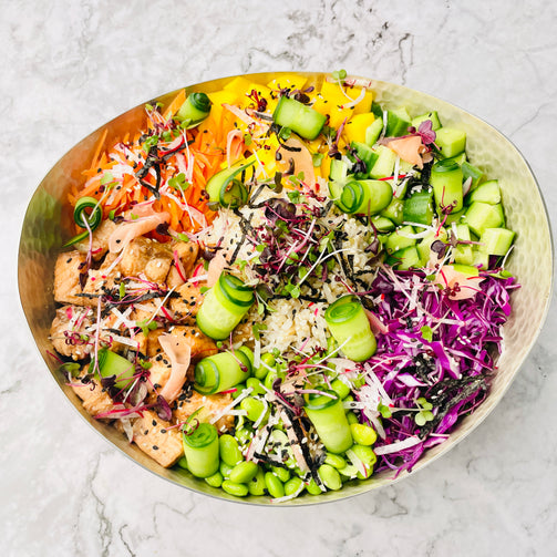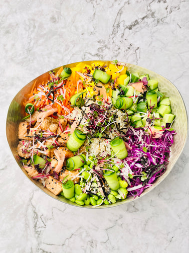 Treat yo'self to a mouth-watering Salmon Poke Bowl! Enjoy fresh, marinated salmon over a bed of rice and veggies. A delicious and healthy meal that'll make you say "Mmm!".